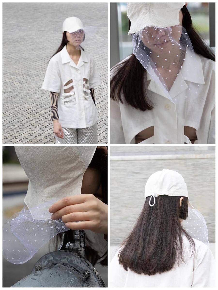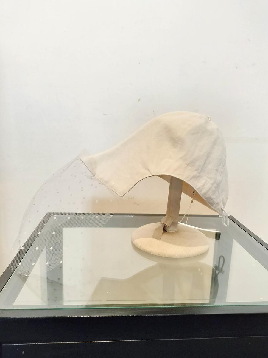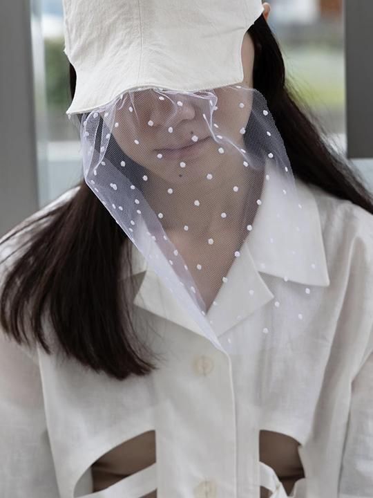 ドットチュールが頭頂部のボタンで留められていて、外すとカーテンのように顔周りを覆います