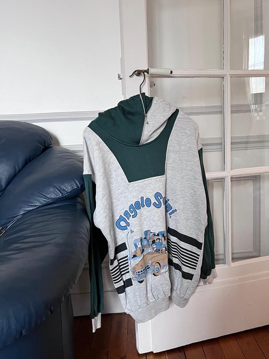深緑と杢グレーの切り替え、ジップアップのフード、遊び心と品のあるプリント柄がたのしい、"Angelo Santini" のフーディー