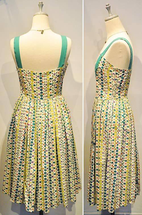見ているだけで気持ちが浮き立つような、色とりどりのプリントが楽しい50'sサンドレス。